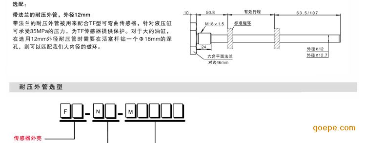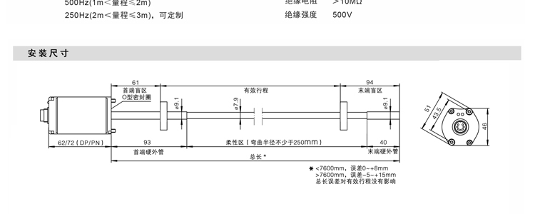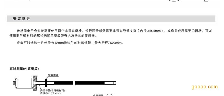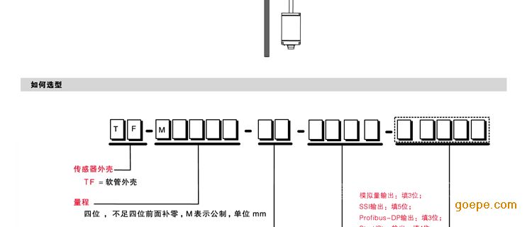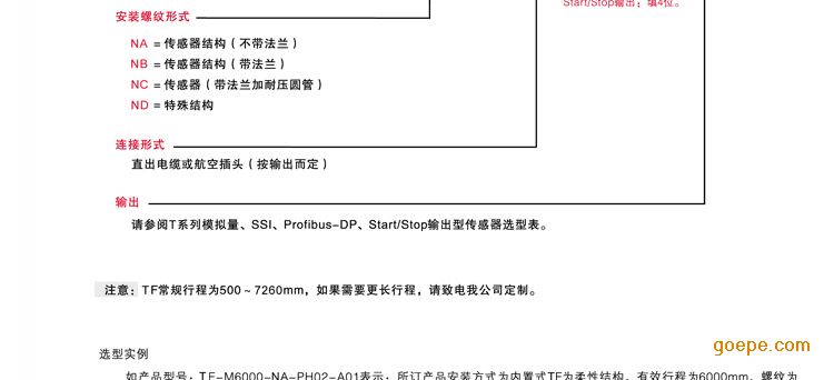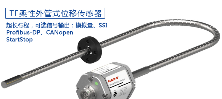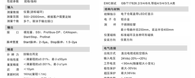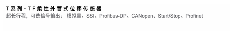 ●可卷曲包装减少空间,节省包装与运输的成本。产品名称 T-TF柔性外管传感器 测量范围 500mm~25000mm, 根据客户需要定制 温度系数 <30ppm/℃ 输出信号 模拟量、SSI、Profibus-DP、CANopen、Start/Stop 供电电压 24Vdc(-20%~+20%) 温度范围 -40℃ ~ +105℃ 电气防护 IP65(加入耐压外管后,保护等级可达IP67)
