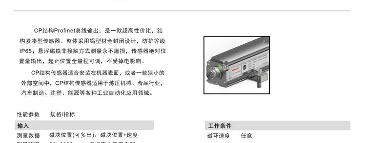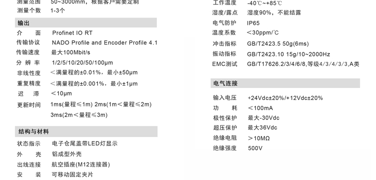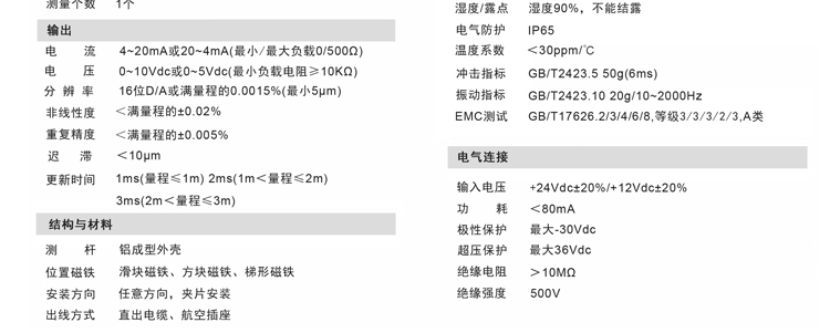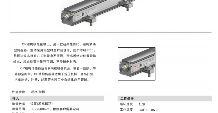 ●悬浮磁铁,可用垂直间隙zui大可达15mm 。产品名称 外置高端型传感器 测量范围 50mm~4500mm,根据客户需要定制 湿度/露点 湿度90% ,不能结霜 输出信号 0-20mA 4-20mA 0-10V -10-+10V 分辨率 16位D/A 温度系数 <30ppm/℃ 电气防护 IP65 环境温度 -40℃~+85℃