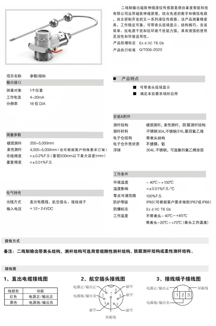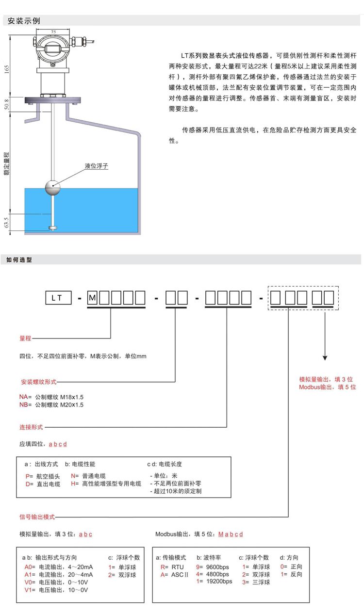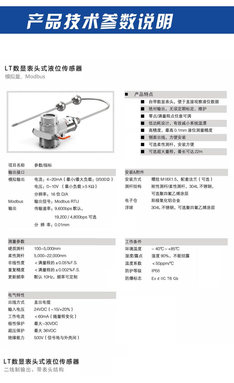 ●可选超大量程,zui长可达22m。产品名称 LT系列数显表头式液位传感器 测量范围 硬质测杆:100-5000mm;
